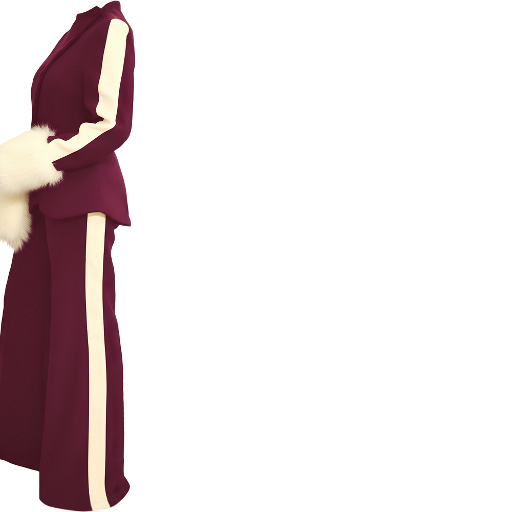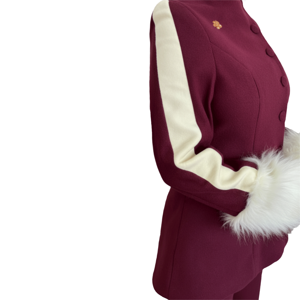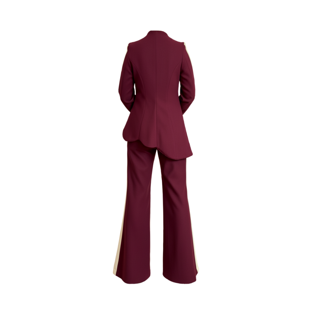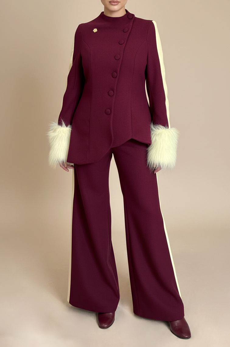 This suit is designed with a modern style and clean look. The fitted top has a high collar and buttons on the side. The soft fur on the sleeves adds a special touch. The matching flared pants are made from the same fabric with a stripe on the side. Inspired by the hibiscus flower. It makes a stylish and balanced outfit. A gold flower brooch finishes the look with a warm shine. Top details: Fitted shape, high neck, side buttons, woolen fabric, and fur cuffs. Pants details: Wide-leg, woolen fabric. Embellishment: A gold-colored hibiscus brooch. Colors: Burgundy & yellow.