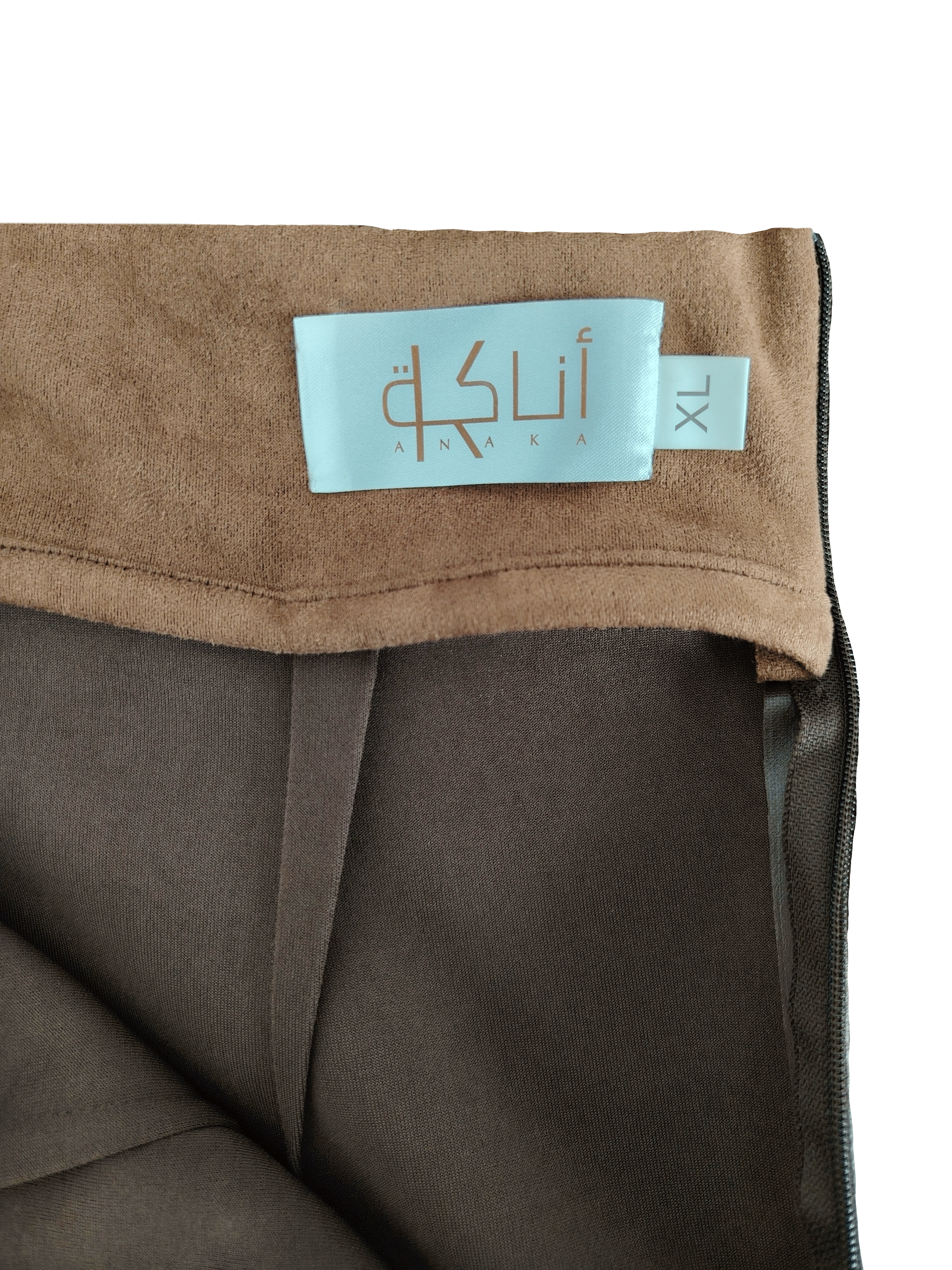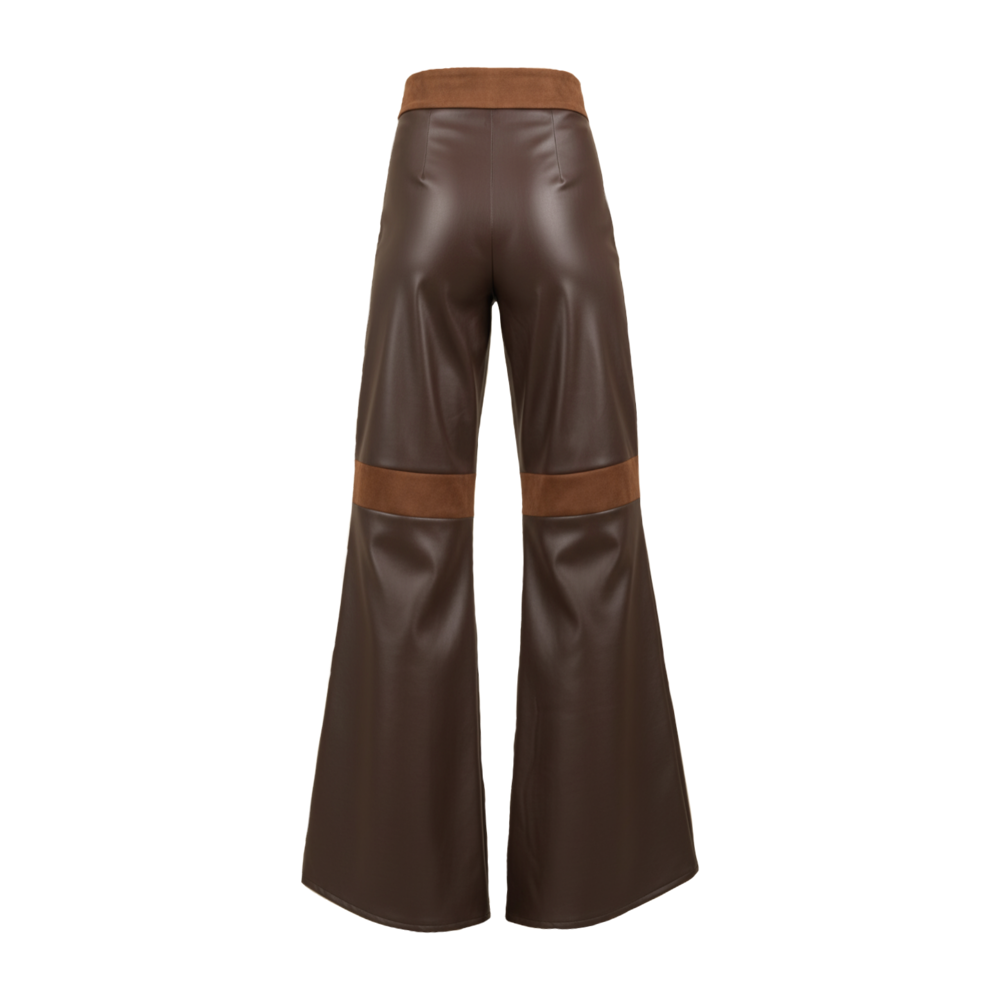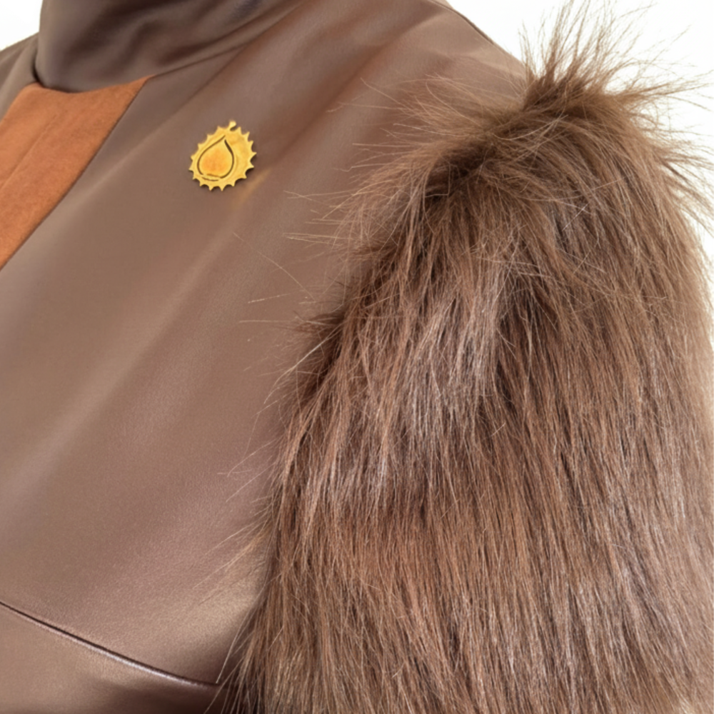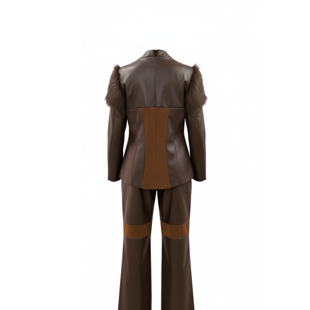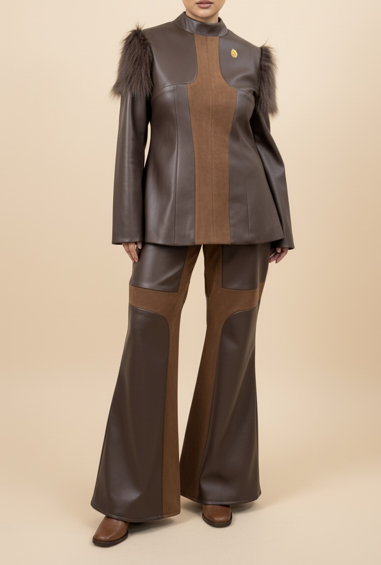 This suit is designed with clean lines and a modern style. The structured top features a high collar and textured shoulders that add a unique look. The matching mixed-fabric flared pants follow the same pattern. Inspired by a chestnut. Making a balanced and stylish outfit. A customized gold-tone brooch finishes the look and gives a warm touch. Top details: Structured, fitted shape, high neck, textured shoulders, PU leather, fur, and suede fabrics. Pants details: Wide-leg, PU leather and suede fabrics. Embellishment: A customized, gold-toned chestnut-shaped brooch. Colors: Dark brown & caramel Brown.