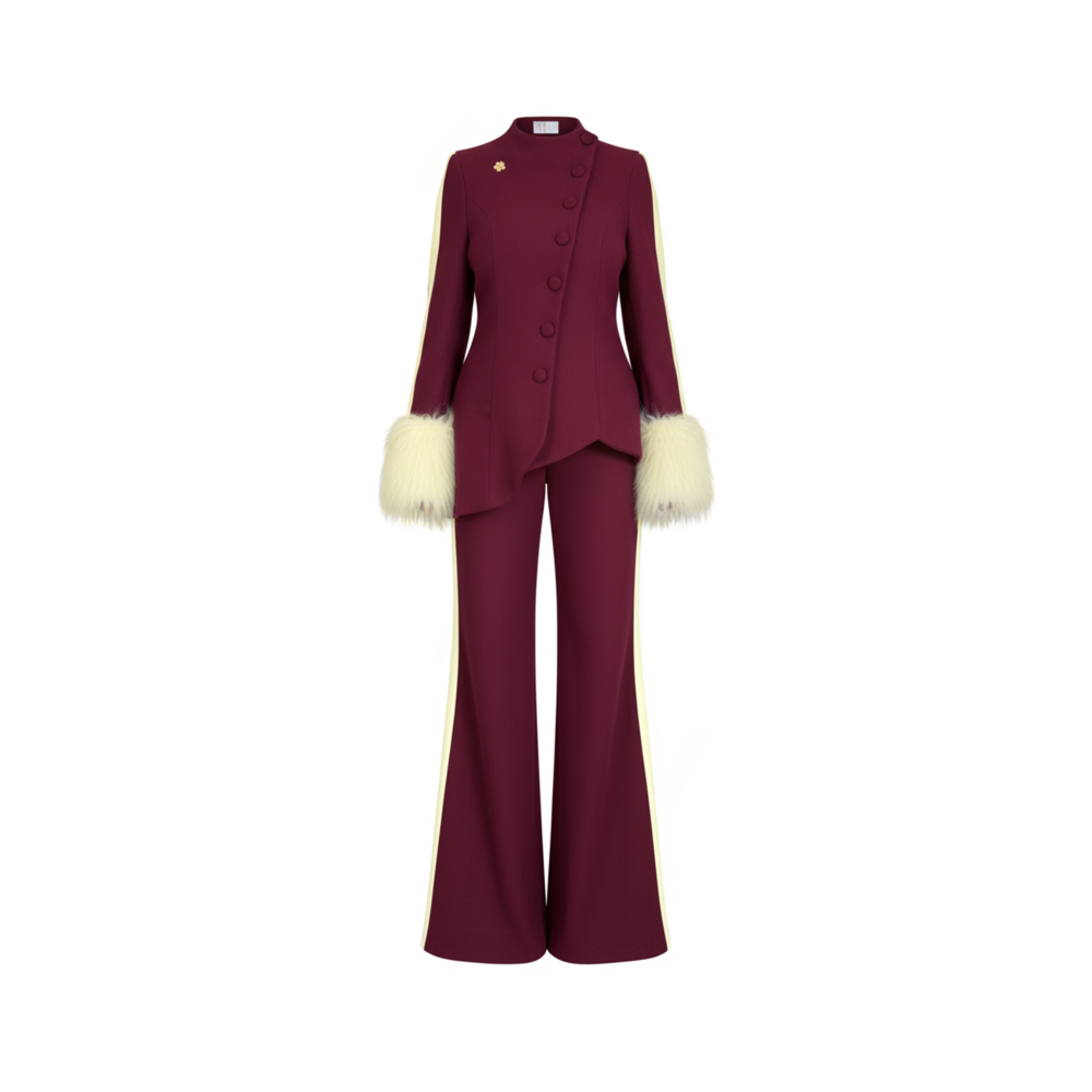 Inspired by the hibiscus flower, this suit reflects warmth and quiet confidence. The structured top and flowing pants create a balanced silhouette designed to move with ease. Crafted from woolen fabric and finished with a symbolic hibiscus brooch. Produced in limited quantities.