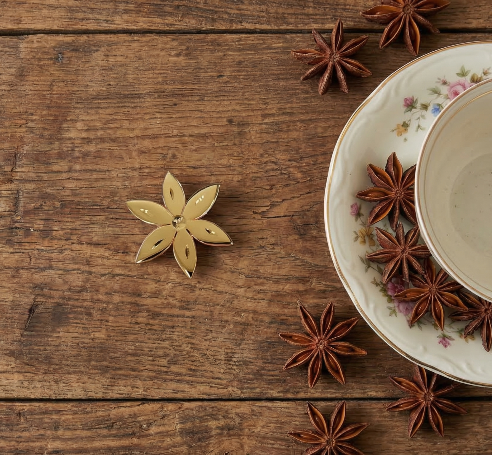 A symbolic star anise brooch created as part of The Ani Dress. Designed to serve as a signature element of the dress. Crafted to be worn with the dress or styled independently.